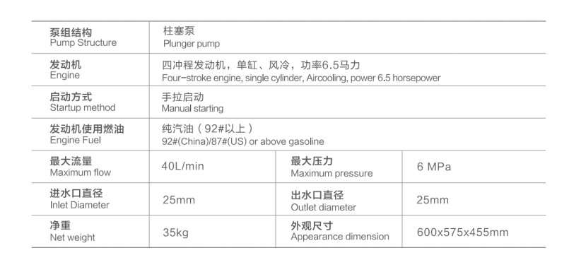 1.泵組結構:柱塞泵2.發動機:四沖程發動機,單缸、風冷,功率6.5馬力