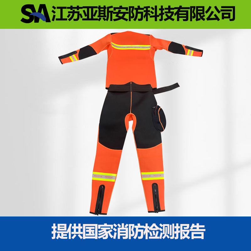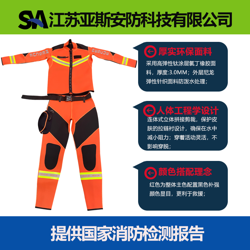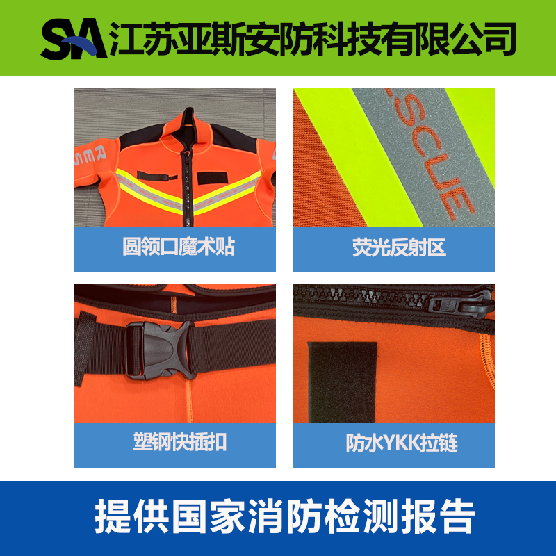 5在膝蓋和小腿處都有聚氨酯涂層墊,可以提供額外的保護;6.在軀干的兩側部位有大摩擦力區域用于搭配PFD固定使用;7.手臂和腿部有熒光反射區,并且有RESCUE救援字樣,提高了救援者的警示性