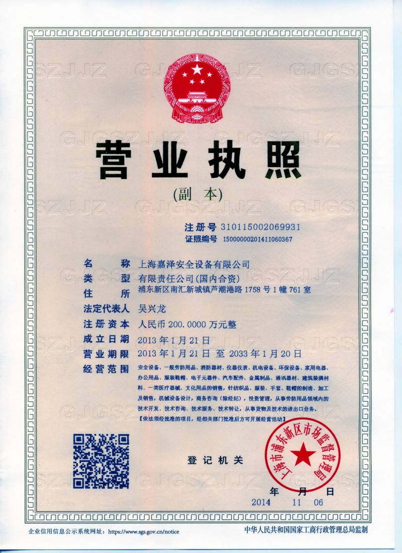 經(jīng)營范圍:安全設(shè)備、勞防用品、消防器材、儀器儀表、機電設(shè)備、環(huán)保設(shè)備、紡織品、服裝、手套、鞋帽的制造、加工及銷售; 從事貨物及技術(shù)的進出口業(yè)務(wù) 證書圖片 |