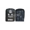 該單警裝備包面料及輔助配件的顏色為黑色,圖案和文字的顏色為白色。警用裝備包上方、兩個側面有加強筋和提手,并且上方有姓名插袋和編號牌,警用裝備包主要將單警裝備集中歸放,方便出警。