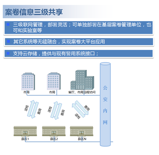 公安內網授權用戶可隨時根據權限查詢本單位案卷信息、案卷狀態、案件信息、案件及相關圖片信息;根據授權,遠程對案卷出入庫和處理申請進行審批,添加審批意見;