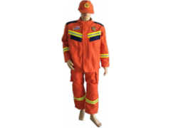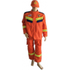 產品符合XF 633-2006《消防員搶險救援防護服裝》標準要求。采用雙層結構織法,表層面料采用原液芳綸橘紅面料,內層為原液芳綸與舒適性纖維天絲混紡,單位面積質量200(±10)g/m2。夏季服裝為襯衫式上衣配長褲設計,肩背部拼接。上衣肩背部設計拼接,面料為深火焰藍色,上衣胸前設置貼袋,雙線固定口袋布,袋蓋為深火焰藍色。大腿兩側設置立體貼袋。。