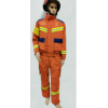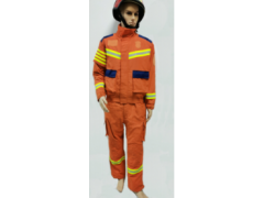 產品符合XF 633-2006《消防員搶險救援防護服裝》標準要求。采用雙層結構織法,表層面料采用原液芳綸橘紅面料,內層為原液芳綸與舒適性纖維天絲混紡,單位面積質量200(±10)g/m2。冬季服裝采用夾克式上衣配長褲設計,肩背部拼接。上衣肩背部設計拼接,面料為深火焰藍色,上衣設置貼袋,雙線固定口袋布,袋蓋為深火焰藍色。大腿兩側設置立體貼袋。。